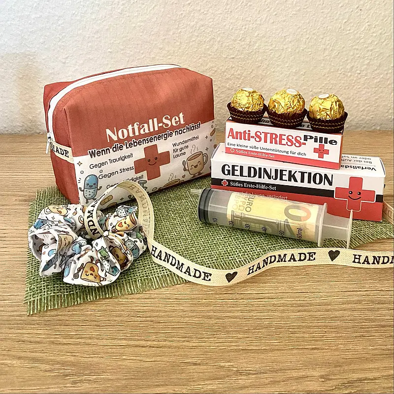 Handgefertigtes Notfall-Set-Geschenk №7 Geschenkset Anti-Stress mit Haar-Accessoire und Geldspritze zur schnellen Stimmungsverbesserung.