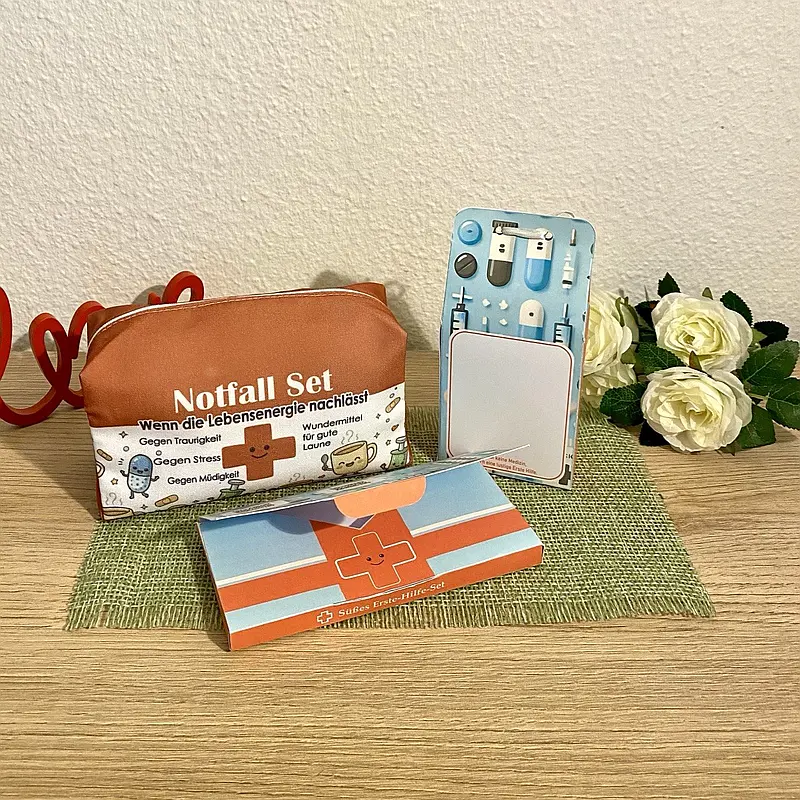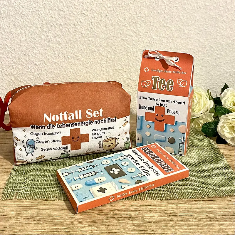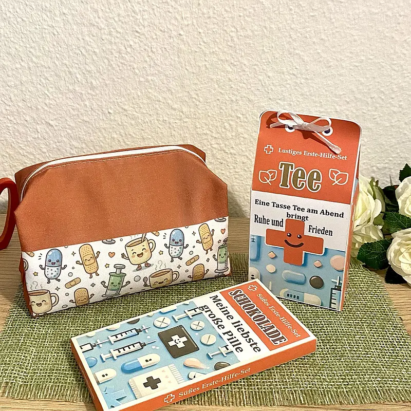 Handgemachte Kosmetiktasche und Boxen zum Selbstbefüllen – es wird verschenkt, wenn man einer guten Person gute Laune schenken möchte. Für Menschen mit Sinn für Humor. Kann auch bei Krankenbesuchen mitgenommen werden, um die Stimmung zu heben. Ein Geschenk als Dankeschön für Ärztinnen und Ärzte.