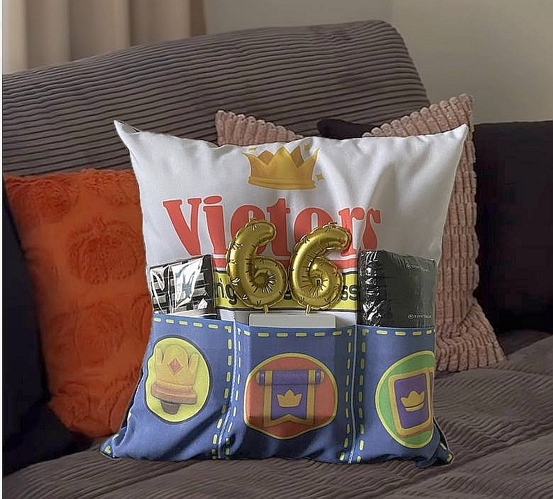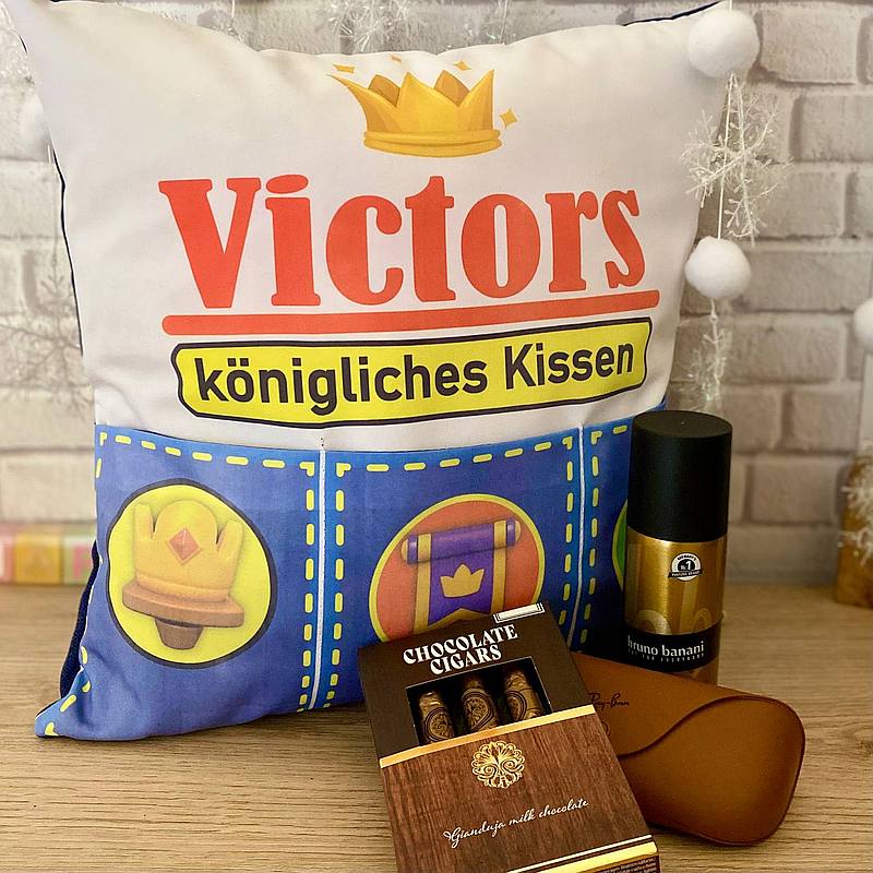 Das Kissen wird mit einem Namen personalisiert. Das königliche Kissen hat drei Taschen für Überraschungen. Ein kreatives und praktisches Geburtstagsgeschenk