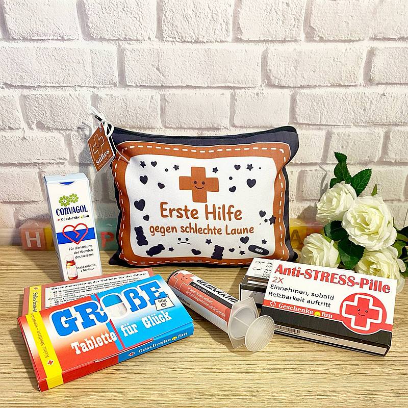 • Das Set besteht aus: einer Kosmetiktasche mit dem Aufdruck auf einer Seite „Erste Hilfe gegen schlechte Laune“ und auf der anderen Seite „Alles Gute zum Geburtstag!“