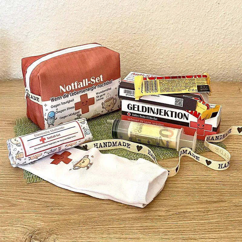 Notfall-Geschenkset Nr. 7, Anti-Stress, mit elastischer Mullbinde und Geldspritze zur schnellen Stimmungsverbesserung.