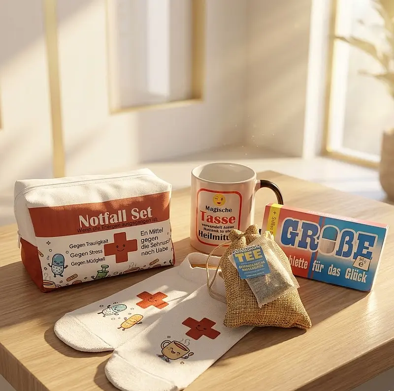 Ich nähe eine personalisierte Kosmetiktasche und lasse eine bezaubernde Tasse sowie Socken im medizinischen Design bedrucken. Tee und eine Schokolade können Sie ganz nach Ihrem Geschmack selbst auswählen – ich stelle nur die Verpackung für Tee und Schokolade bereit.