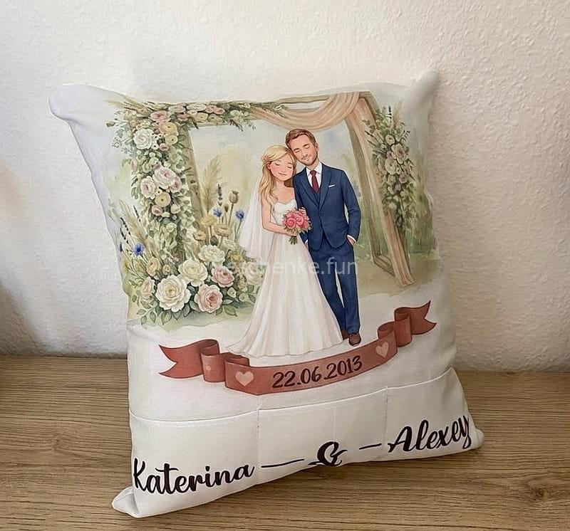 Die Namen des Brautpaars und das Hochzeitsdatum auf dem Kissen â das ist eine bleibende Erinnerung. Und die Taschen… nun, Sie wissen ja, wie schwer es ist, die Fernbedienung zu finden, wenn man sie braucht! đ Jetzt hat sie ihren stilvollen Platz.