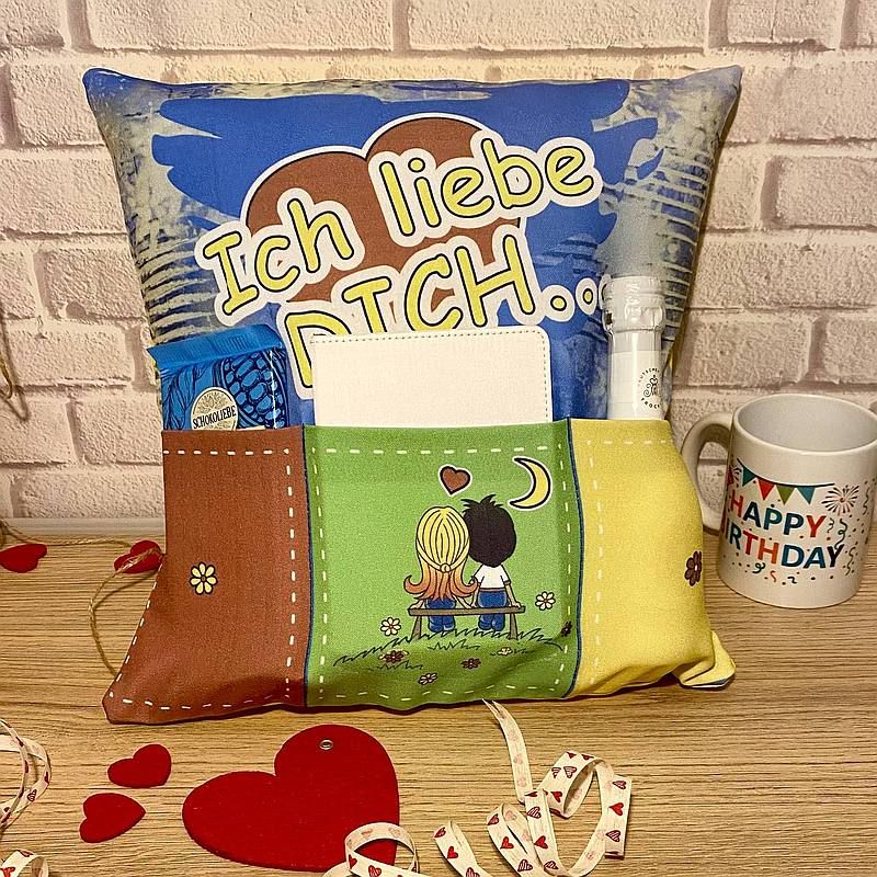 Das Kissen verfügt über mehrere bunte Taschen mit niedlichen Prints, in die alle Geschenke liebevoll von Hand eingelegt werden.
