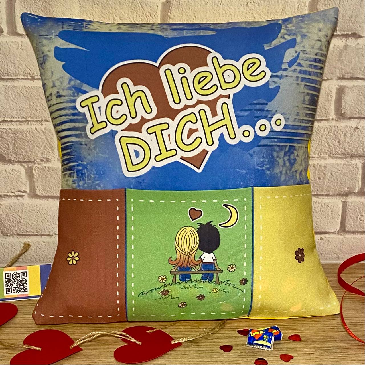 Dekokissen „Ich liebe dich“ mit Taschen und Plastikdose mit Liebesgründen für Liebesgründen.