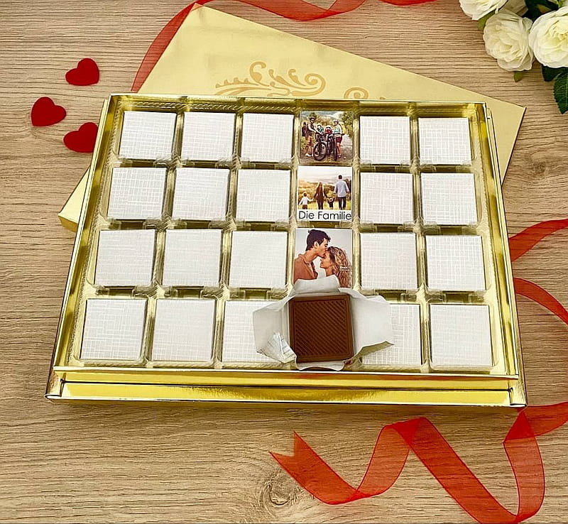 Verschenken Sie Ihre Fotos auf Schokolade und überraschen damit Freunde und Familie. Bei unseren Schokoladen Bildern werden 24 Täfelchen aus feinerster Ovalette Madlen Milchschokoladenpralinen mit Ihren eigenen Fotos umhüllt.