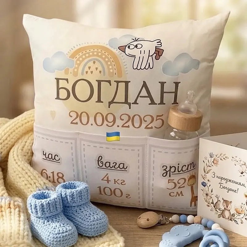 - Іменна подушка з кишенями та метрикою. Цей подарунок я створила для ваших маленьких сонечок. Я друкую на подушці метрику дитини, крою шию подушку із кишенями. Ви зможете наповнити кишені на свій розсуд, що забажаєте. Я додам ще листівку в такому ж дизайні як подушка.