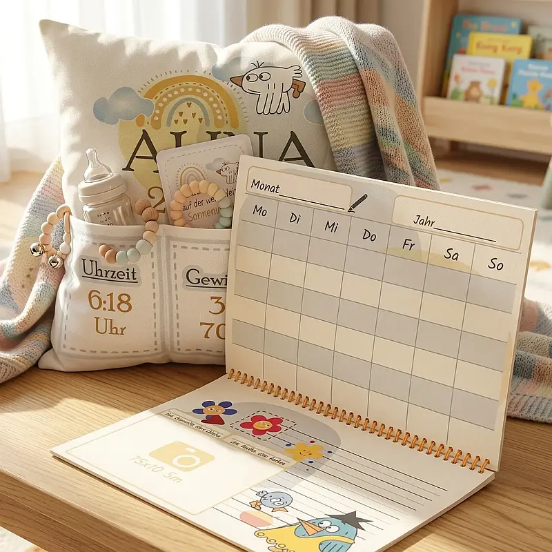Супер популярний персоналізований подарунковий набір для новонароджених – це дитяча подушка з кишеньками з іменем та метрикою + календар з наліпками “Мій перший рік” в одному дизайні.